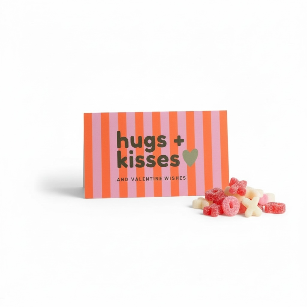 Celebrate Valentine's Day in style with our Hugs + Kisses Valentine cards. These bold striped cards feature a thoughtful message and come with a blank side for your personal touch. Pair them with X + O shaped gummy candy for a truly special treat.